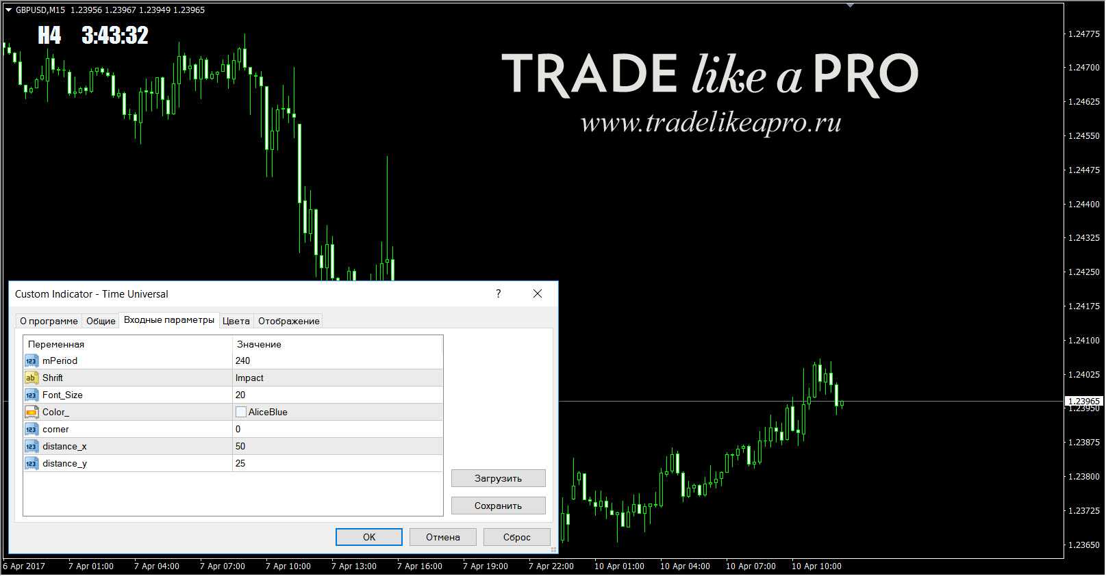 Time Universal (Time Universal_fix) – индикатор показывает время закрытия той свечи, которая вам нужна – он не поменяет данные при переключении таймфреймов. Кроме того шрифт, цвет и размер выбирается пользователем. Мод Time Universal_fix имеет всё тоже, только устанавливается в подвале любого другого индикатора.