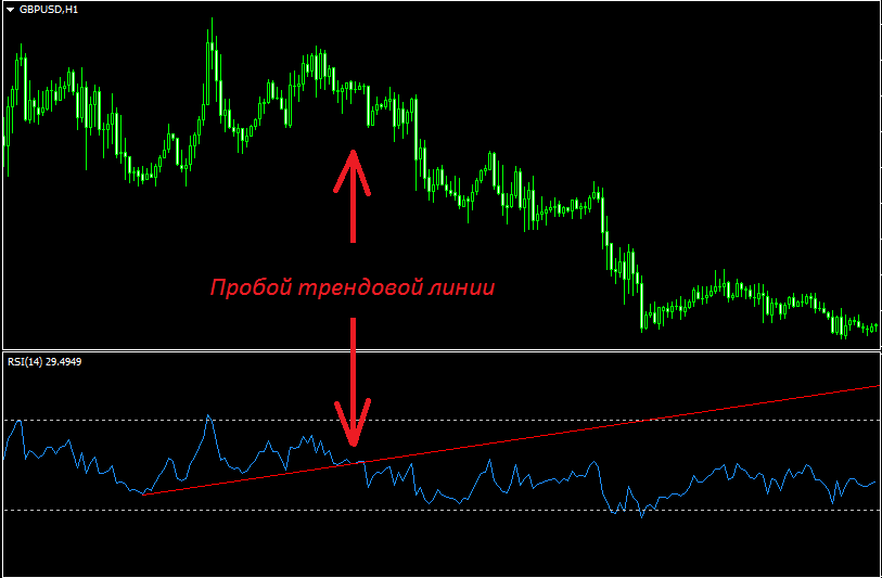 Суть сводится к следующему: график линии индикатора RSI можно рассматривать в том же ключе, что и обычный график. То есть проводить графический анализ по самому RSI. Это означает, что по всем обычным правилам трендового анализа мы строим линии тренда, которая, каким бы странным это не показалось, будет работать также, как и на самом графике. Таким образом, при подходе цены к совершенно непримечательной отметке, который будет сопровождаться подходом линии индикатора к линии тренда, можно ожидать разворот графика. В подобной работоспособности можно убедиться, просмотрев график на истории и проводя трендовые линии.