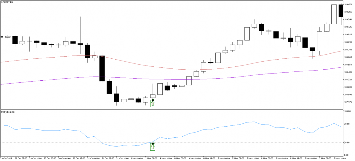 Это как раз тот сигнал, который является особенностью. Применение RSI индикатора в этом случае очень нестандартно.