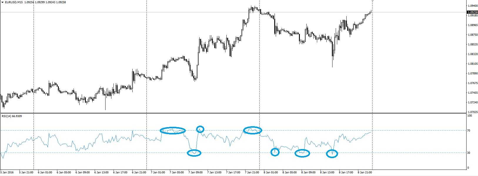 Обратите внимание на рисунок с примерами точек входа по индикатору RSI: курс евро/доллара вошел в зону перекупленности – 70, пересек ее сверху вниз и мы входим на продажу, и, как только цена вошла в зону перепроданности – 30, мы входим на покупки. Данная тактика очень эффективна во флете, когда позиционные трейдеры ждут ясности на рынке Форекс, то скальперы с помощью индикатора RSI просто напихивают свои карманы деньгами вот такими точными короткими сделками