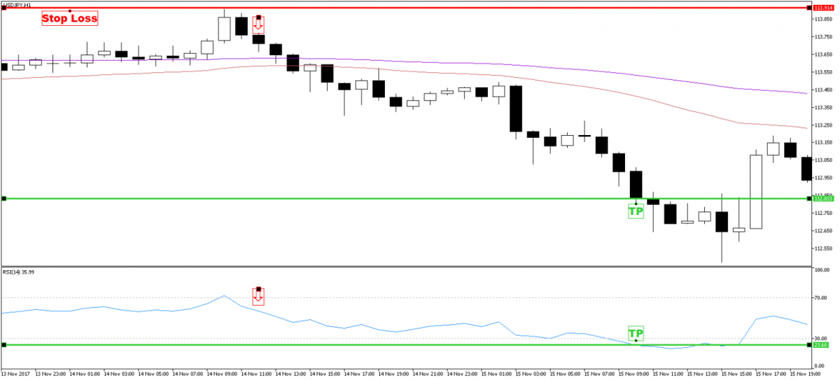 Ордер на продажу следует открывать, когда есть нисходящий тренд, и индикатор RSI пробивает уровень 70 от сверху вниз.