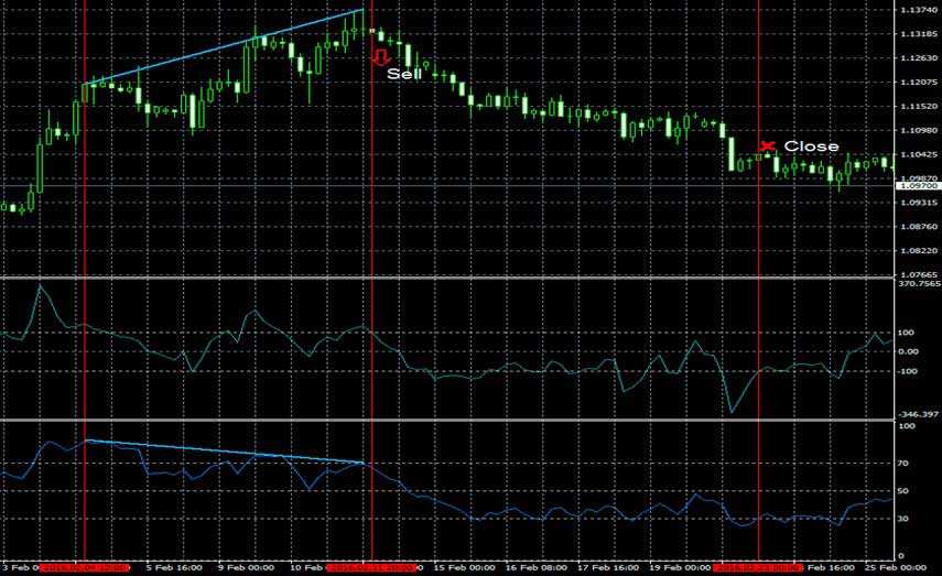 С появлением новой свечи открываем продажу. Закрыть её можно при первом пересечении индикатором CCI уровня -100 снизу вверх, но в этот момент индикатор RSI не даёт нам никаких подтверждающих сигналов. При одном из последующих пересечений индикатором CCI уровня -100 снизу вверх у нас добавляется и сигнал от индикатора RSI: пересечение уровня 30 снизу вверх (этот момент так же помечен вертикальной красной чертой). На открытии следующей свечи закрываем продажу с хорошей прибылью.