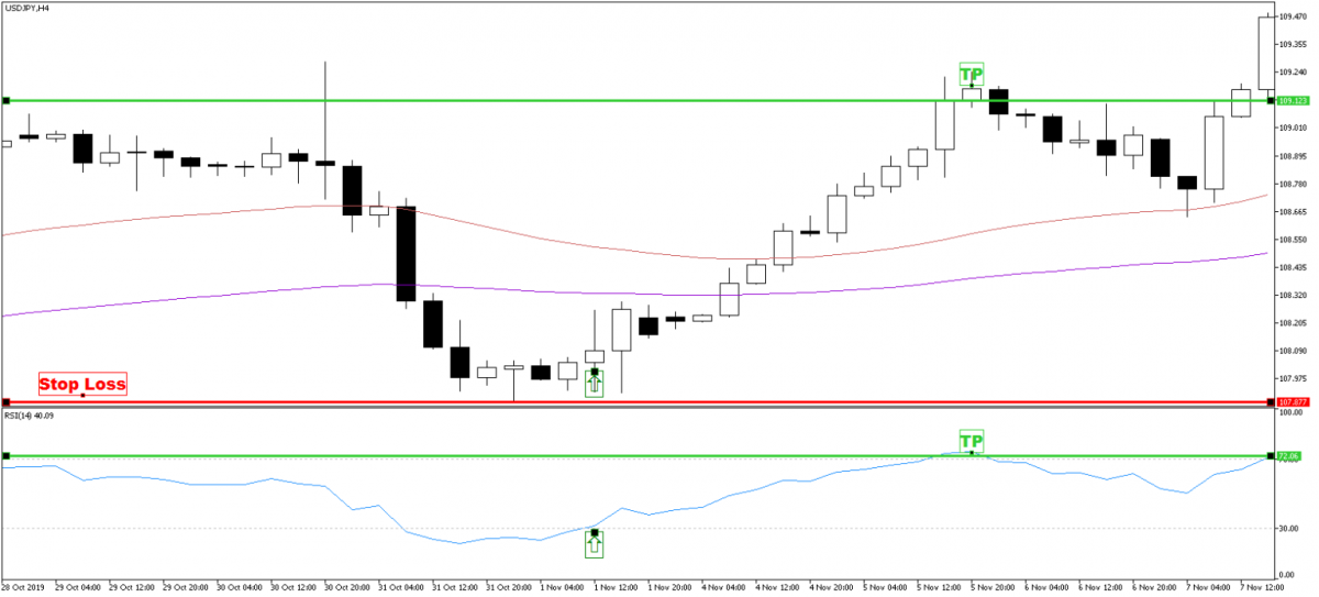 Следовательно, ордер на покупку следует открывать, когда есть восходящий тренд, и индикатор RSI пробивает уровень 30 снизу.