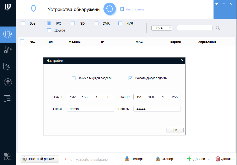 Необходимо указать (настройки поиска) подсеть, в которой будет производиться поиск камеры. Так как всего 255 адресов возможных в сети 192.168.1, то укажем от 0 до 255. Жмем ОК и находим камеру.