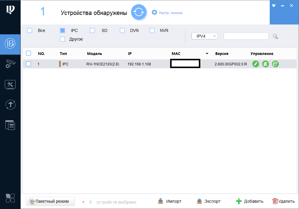 Справа есть зеленые кнопки, с помощью которых можно: изменить IP адрес, детали — просмотреть IP адрес и версию ПО с серийным номером камеры и войти в web-интерфейс. Камера по умолчанию откроется в браузере IE.