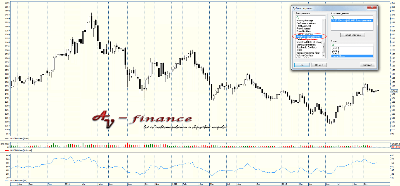 А этот снимок был сделан в торговой платформе QUIK. Это самая популярная торговая платформа на российском фондовом рынке. Для того чтобы прикрепить RSI в этой программе, необходимо на графике нажать правой кнопкой мыши и выбрать пункт меню «Добавить график (индикатор)». Далее вы увидите такое же окошко, как и на моем рисунке.