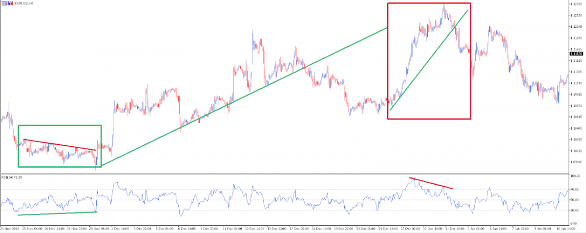 Если тренд продолжится, трейдер сможет наблюдать вторую дивергенцию RSI.