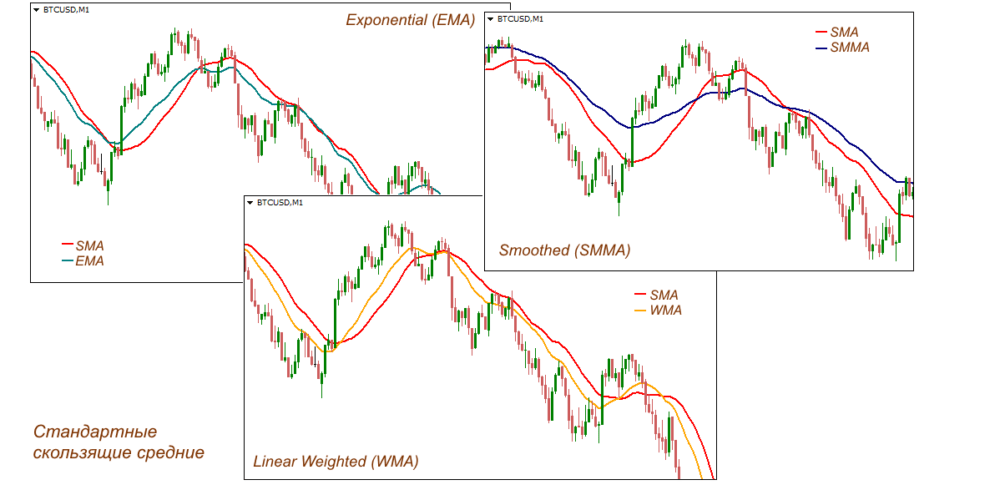 Скользящие средние бывают разными. Всего существует 4 разновидности, которые отличаются формулами расчета: