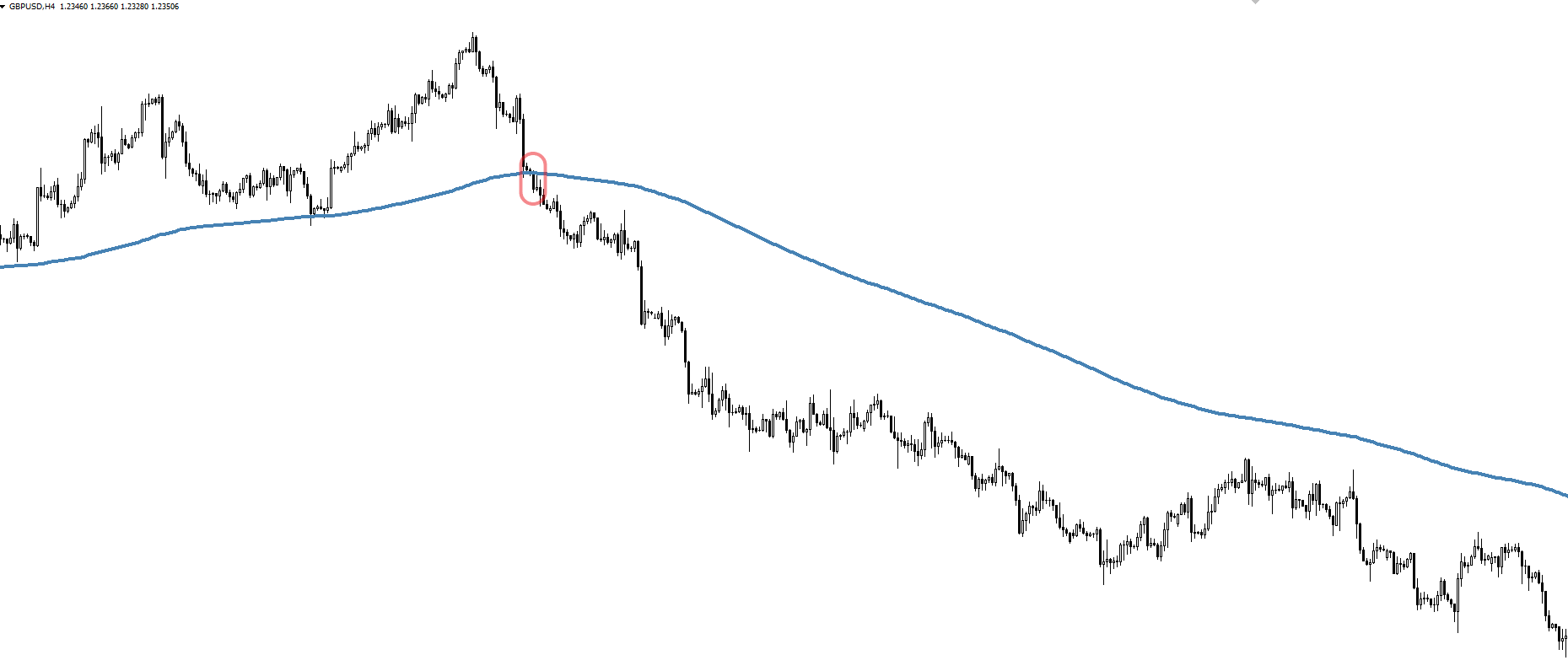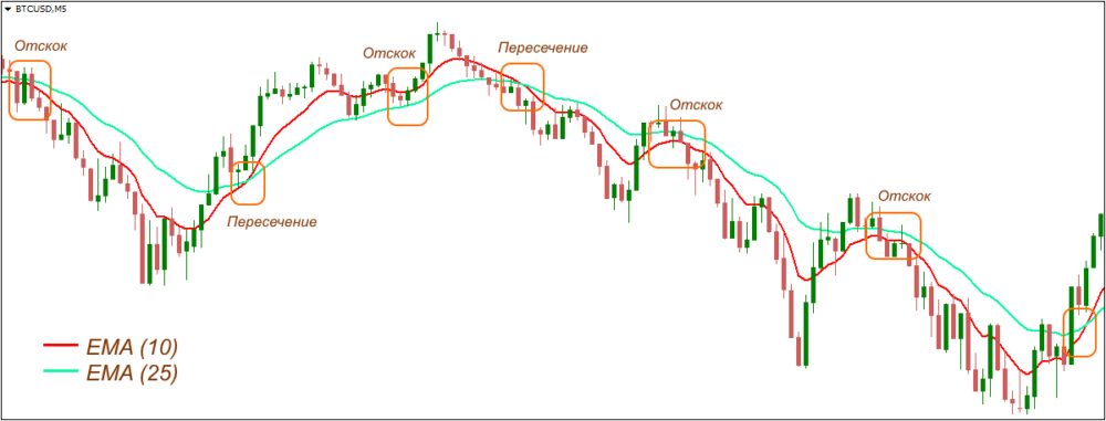 Под пересечением имеет в виду пробой скользящей средней, то есть когда свеча закрывается с противоположной стороны скользящей.