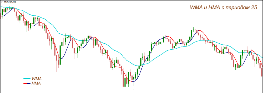 Это самый чувствительный вариант скользящей средней, поэтому для наглядности сравним его с EMA.