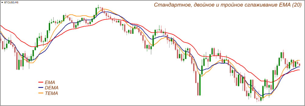 Торговые терминалы позволяют реализовать более сложные методики сглаживания и уменьшения запаздывания. Первый способ это двойное (DEMA) или тройное (TEMA) сглаживание для большей фильтрации «шума».