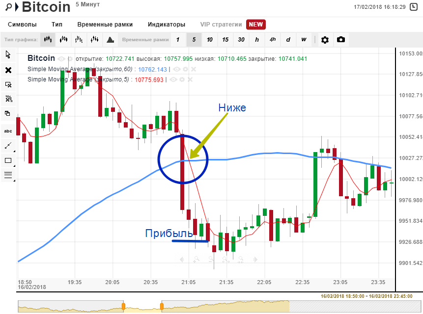 Для заключения контрактов “Ниже”, следует дождаться пересечения синей скользящей средней красной сверху вниз.