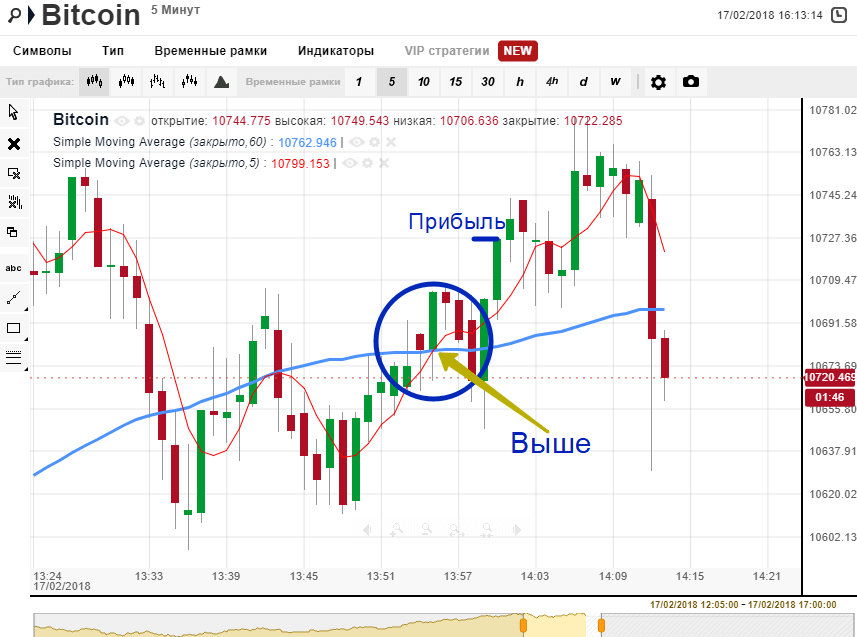 Для заключения сделок “Выше” на графике по стратегии 2 SMA для опционов синюю МА должна пересечь снизу вверх красная МА. Наглядно это выглядит следующим образом:
