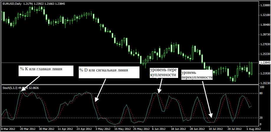 На графике индикатор Стохастик будет выглядеть, как показано на рисунке ниже.
