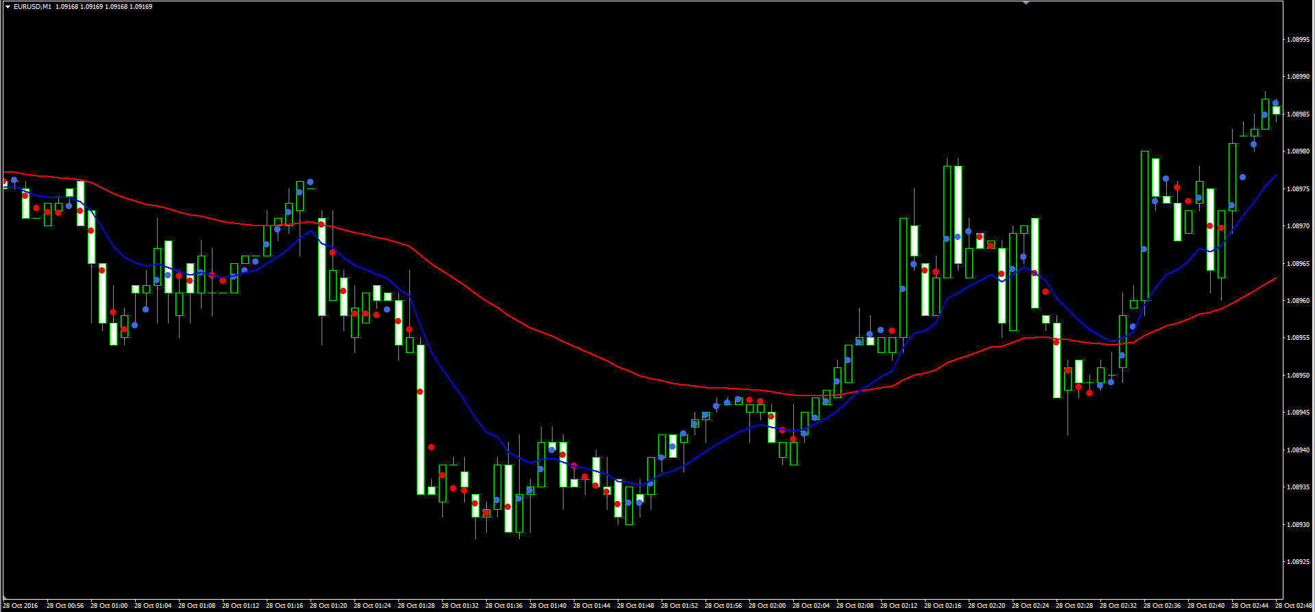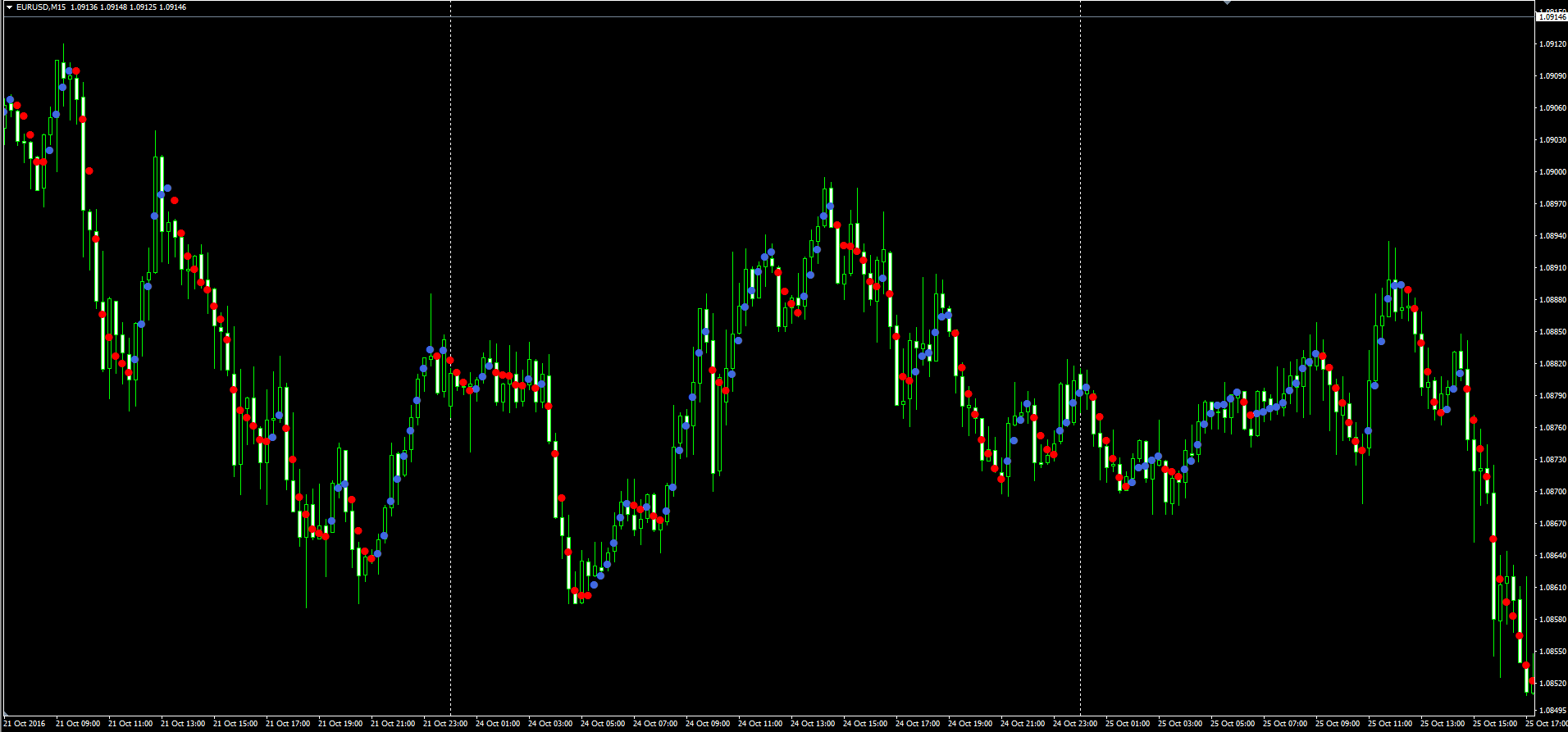 Механизм работы этого индикатора очень прост. Анализируя угол наклона скользящих средних, а также, учитывая цены открытия/закрытия свечей, Dots демонстрирует направление тренда и его изменение, для чего размещает на графике котировок точки двух цветов:
