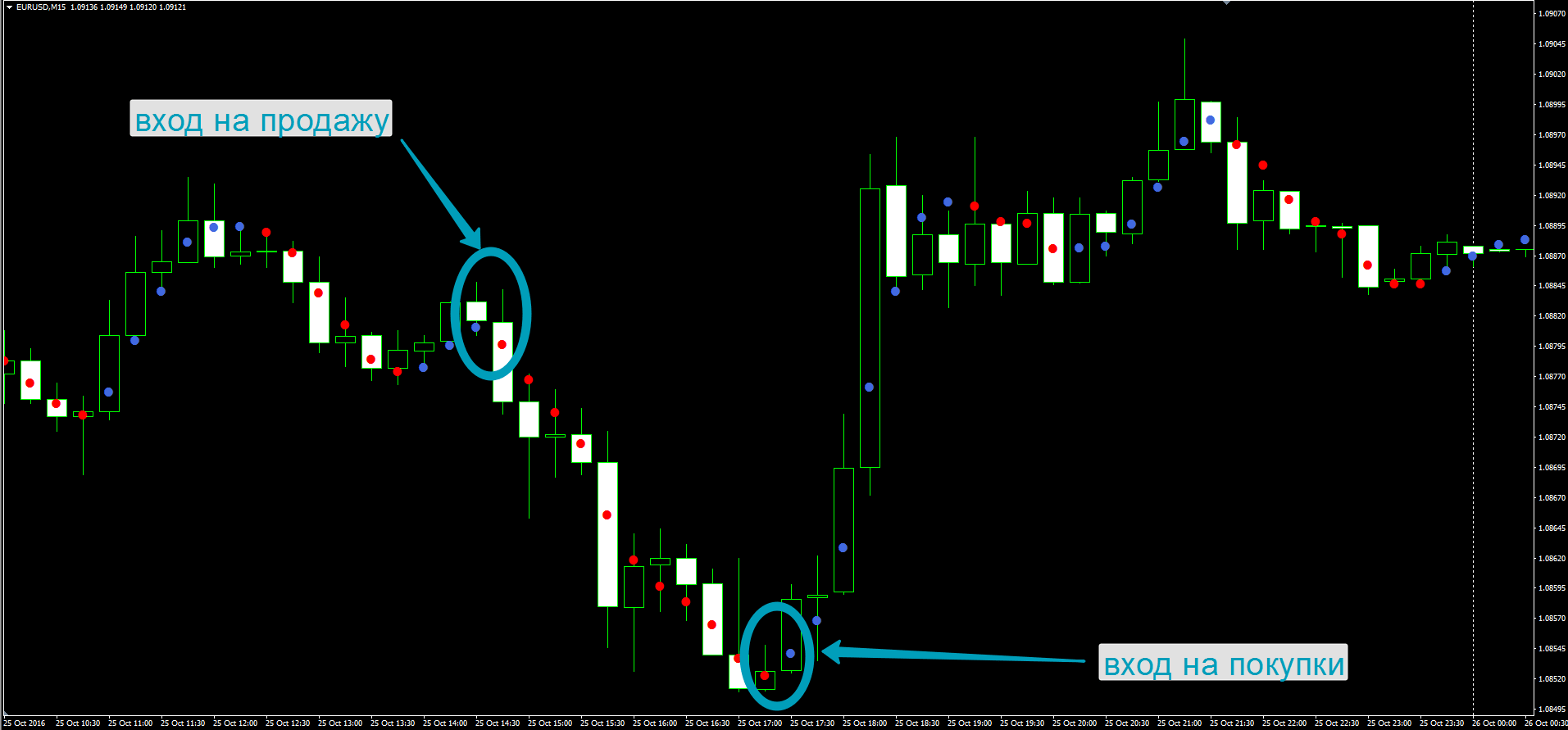 Как вы понимаете, основной сигнал индикатора это изменение цвета точек. Соответственно, торговые сигналы для входа и выхода при заключении и закрытии сделок будут такими: