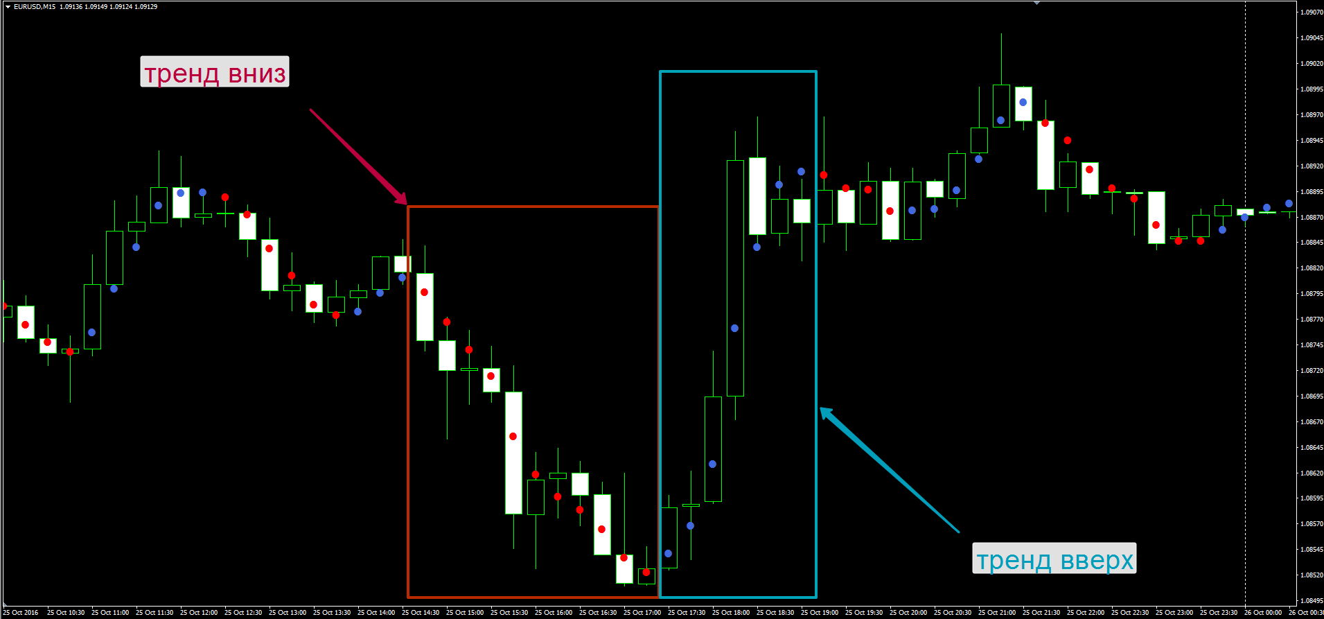 - Изменение синего цвета на красный – место для входа в рынок на продажи (или выход из сделок на покупку)