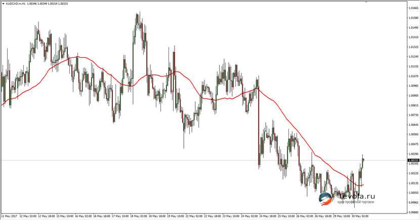На скрине изображена валютная пара AUDCAD и сглаженная скользящая средняя. Как видно, если цена находится далеко от мувинга, то ее как магнитом тянет к средней. Именно на этом и строится логика работы со скользящей средней, но об этом ниже.