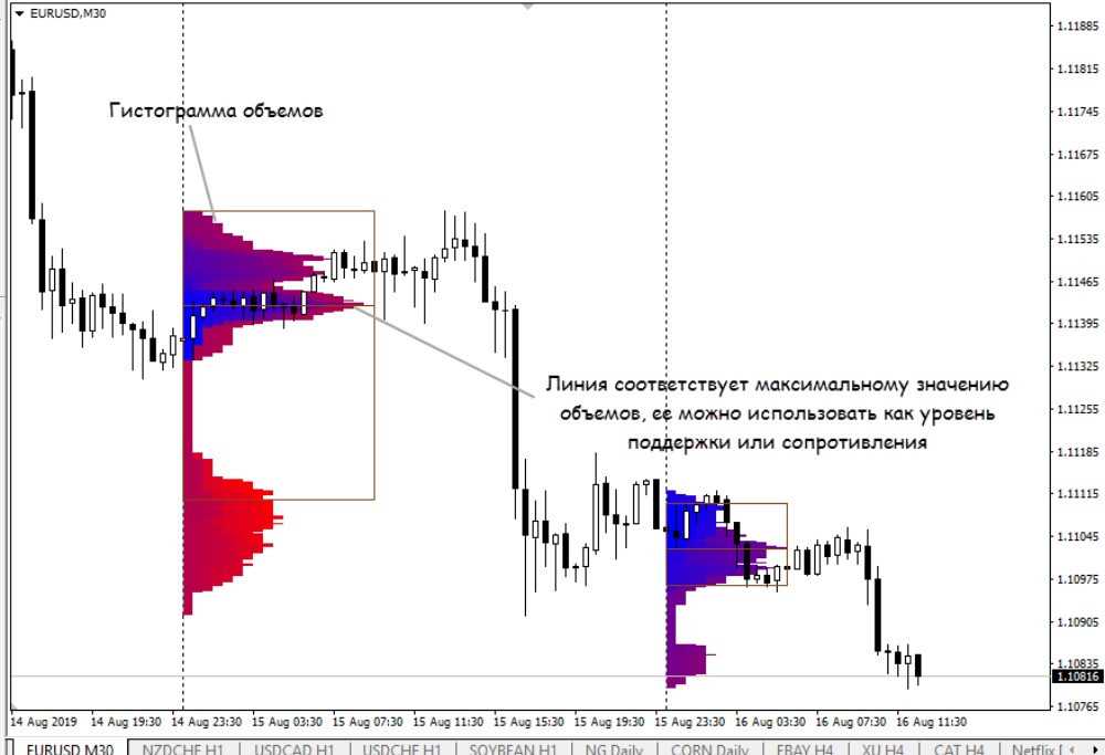 Еще один нестандартный инструмент, для построения уровней используются горизонтальные объемы. Трейдеры сами своей активностью подсказывают нам какой ценовой уровень для них был наиболее значимы. С левой стороны в терминале строится гистограмма горизонтальных объемов, линией выделяется максимальное значение.