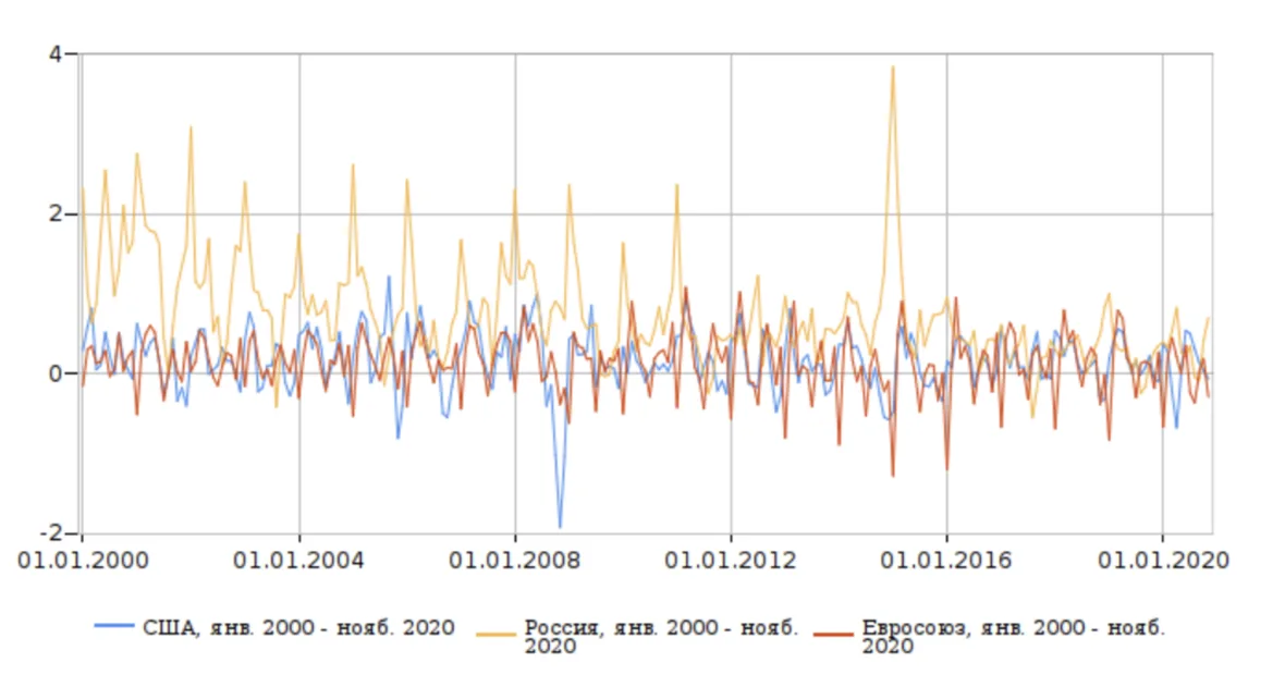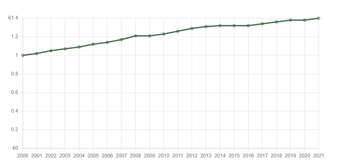 Среднегодовая инфляция евро за период с января 2000 года по август 2021 года составила 1,63% в год. По доллару США за этот же период — 2,23%.