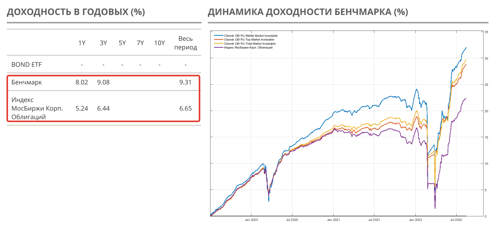 На графике все выглядит замечательно. Наш кандидат уверенно обходить конкурентов. Но меня смущает слишком короткая история. Статистика доходности всего с середины 2019 года. На истории все может быть красиво, но реальные результаты могут сильно отличаться от ожиданий. Обычно новые продукты запускаются в благоприятные для них моменты (ранее писал про исследование на эту тему), чтобы показать инвесторам какие они самые лучшие и доходные. Готов поспорить, что на интервале следующих пары-тройки лет фонд BOND проиграет по доходности тому же индексу корпоративных облигаций. А на более длинных периодах их доходность будет сопоставимой. Это я к тому, чтобы вы не питали иллюзий по поводу супердоходности нового фонда, на раз обыгрывающего широкий рынок корпоративных облигаций.
