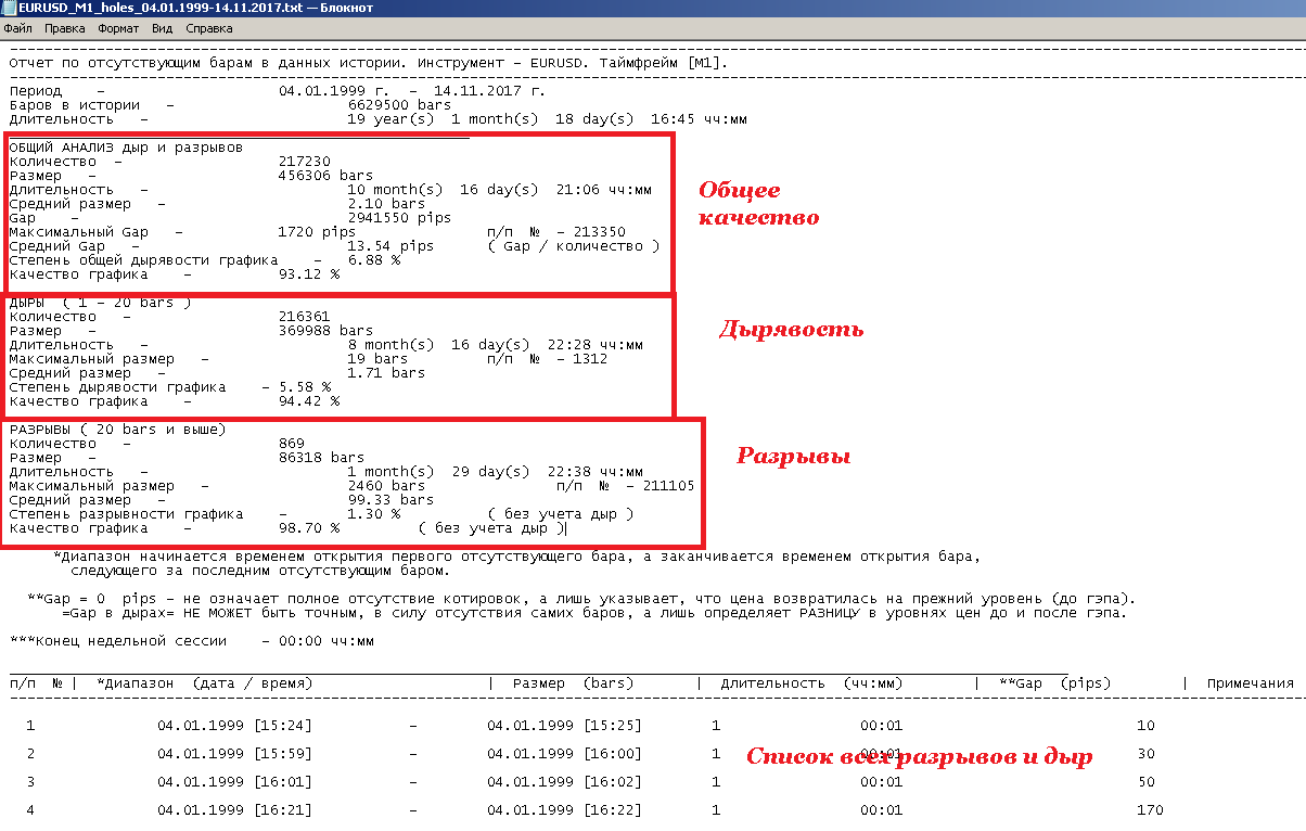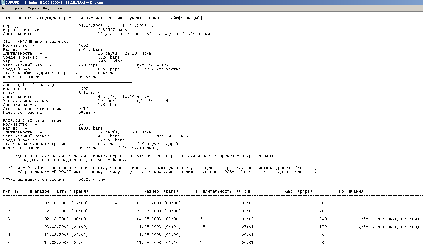 Этот код выявляет в данных истории отсутствующие бары (“дыры”) и разрывы (большие дыры), определяет их размер, длительность и гэп. Работает на всех инструментах и предназначен для внутредневных графиков, поэтому таймфрейм ограничен периодом H4.