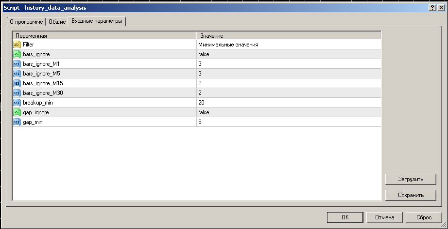 При анализе учитываются только выходные дни (суббота и воскресение – 48 часов), остальные моменты код считает дырами или разрывами. Для удобства работы на графике в коде предусмотрен фильтр, где можно задать количество отсутствующих баров на таймфреймах (M1,5,15,30), которые код будет игнорировать как дыры, количество отсутствующих баров (минимальное значение), которое код считал бы разрывом (по умолчанию 20 баров), а также количество отсутствующих пипсов, которые код будет игнорировать как гэп. После запуска скрипта и окончания его работы вы увидите сообщение: