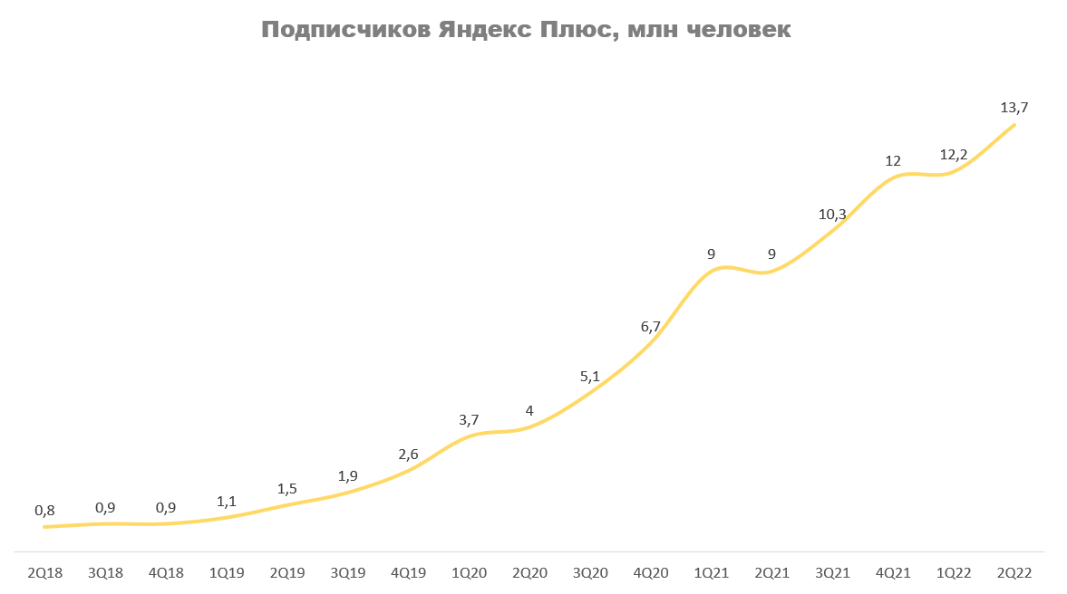 Количество подписчиков Яндекс.Плюса сейчас составляет 13,7 млн человек, что на 52% больше, чем годом ранее. Динамика сильная и думаю она продолжится до 30 млн. Исхожу из аналогии с Тинькофф и Озон.