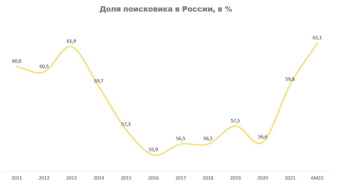 С уходом иностранных компаний доля поисковика в РФ начала расти и на 30 июня составила 62,1% — рекорд за последние 10 лет. Такая динамика обещает хорошие результаты даже в случае замедления экономической активности.