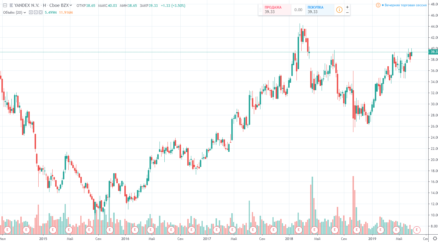 В течение 2018-го года был зафиксирован резкий спад, связанный с новостями о сделке со Сбербанком. Однако к текущему моменту котировки вернулись к уровню $39 за штуку.