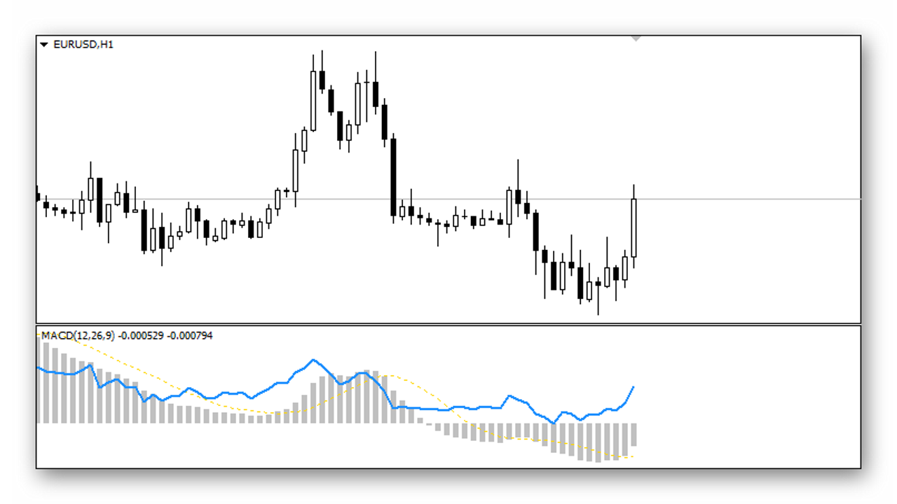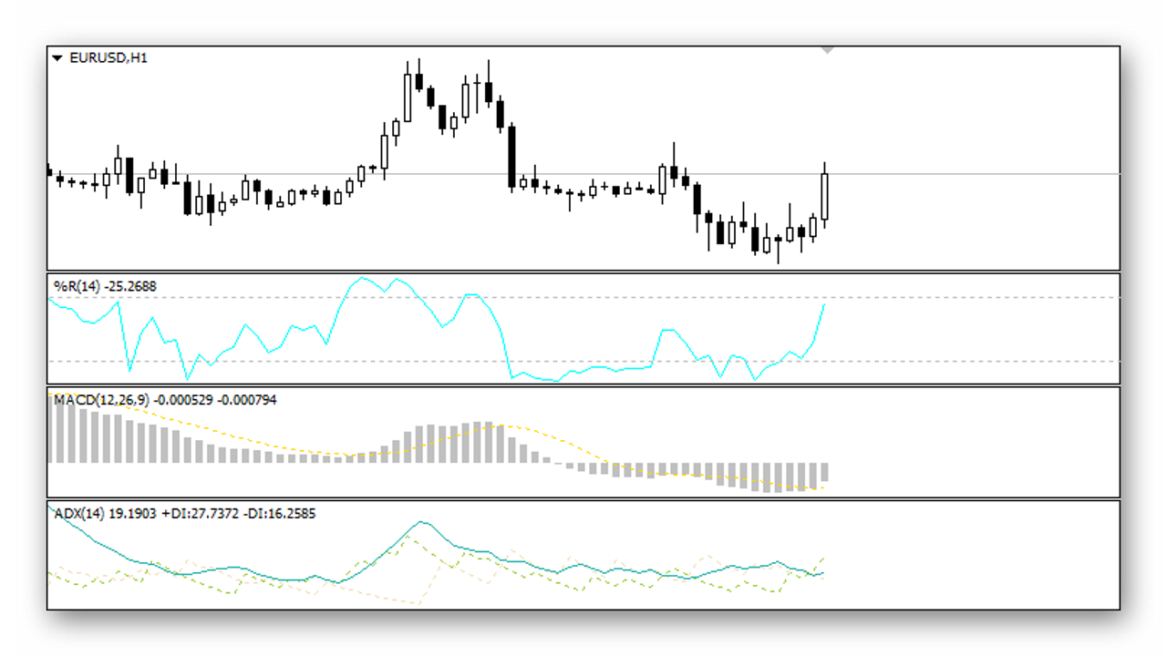 Так вот, хитрость заключается в том, чтобы добавить несколько индикаторов в одно окно. Для этого, сначала добавляем на график один индикатор. А вот следующий индикатор перетаскиваем не на основной график, а в окно первого добавленного индикатора.