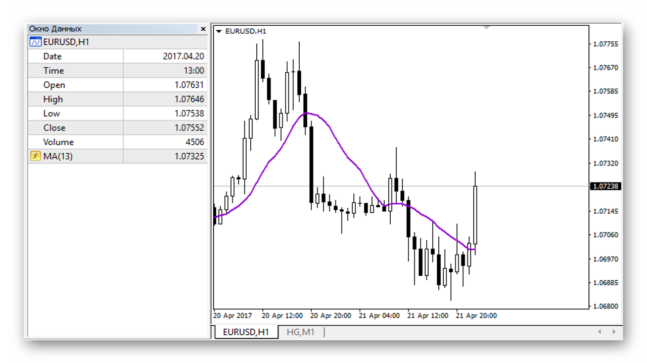 Также, иногда бывает сложно рассмотреть на графике точные значения индикаторов, особенно когда их много. Когда стратегия требует точных входов, необходимо знать точные показания индикаторов относительно той или иной свечи. Эту функцию на себя берет “Окно данных”, вызвать которое можно через меню “Вид” – “Окно данных”, либо через комбинацию клавиш “Ctrl + D”. В окне отображается дата и время свечи, цены OHLC, тиковый объем и показания индикаторов.