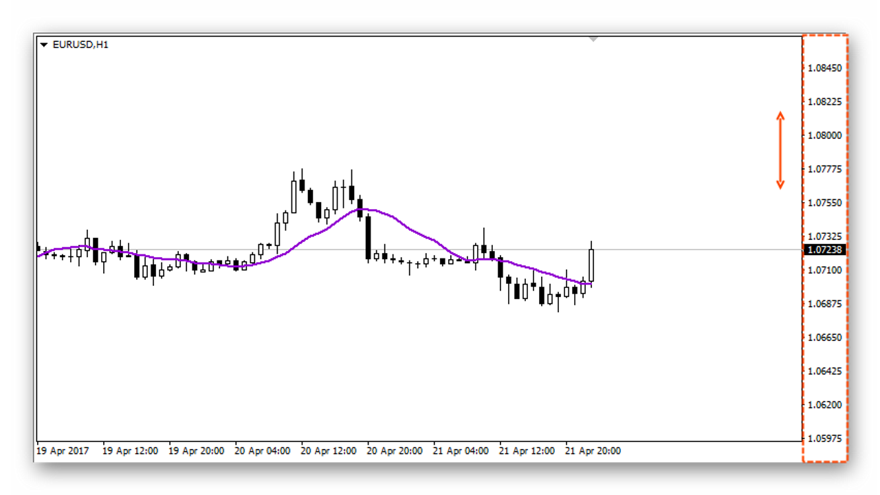 Иногда бывает нужно отметить некий уровень вверху или внизу графика. Чтобы получить доступ к области сверху или снизу от графика цены, достаточно изменить вертикальный масштаб. Для этого зажмите левую кнопку мыши на ценовой шкале и двигайте вверх или вниз для изменения вертикального масштаба.