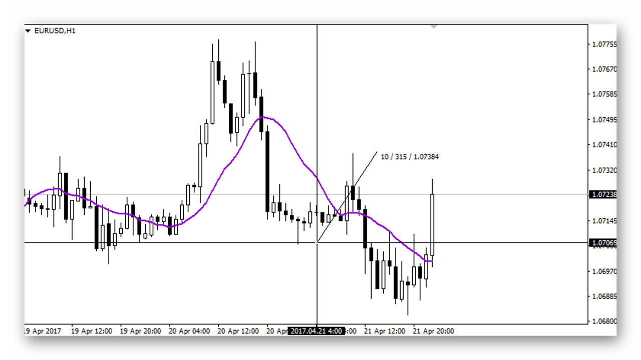 Таким образом очень удобно делать измерения. Первое число отображает расстояние в барах, второе – расстояние в пунктах, третье – цену относительно положения курсора.
