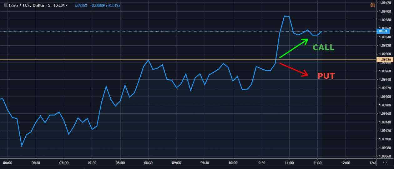 Трейдер, открывая торговый терминал у брокера БО, выбирает инструмент, делает анализ рынка валют, изучает особенности текущего графика и создаёт условия сделки: