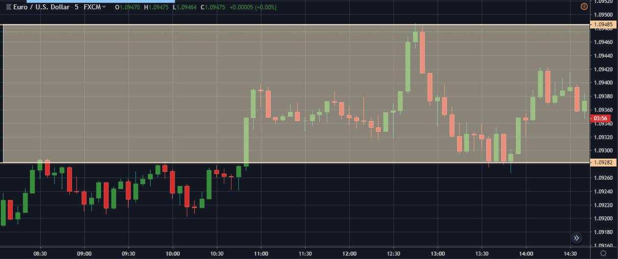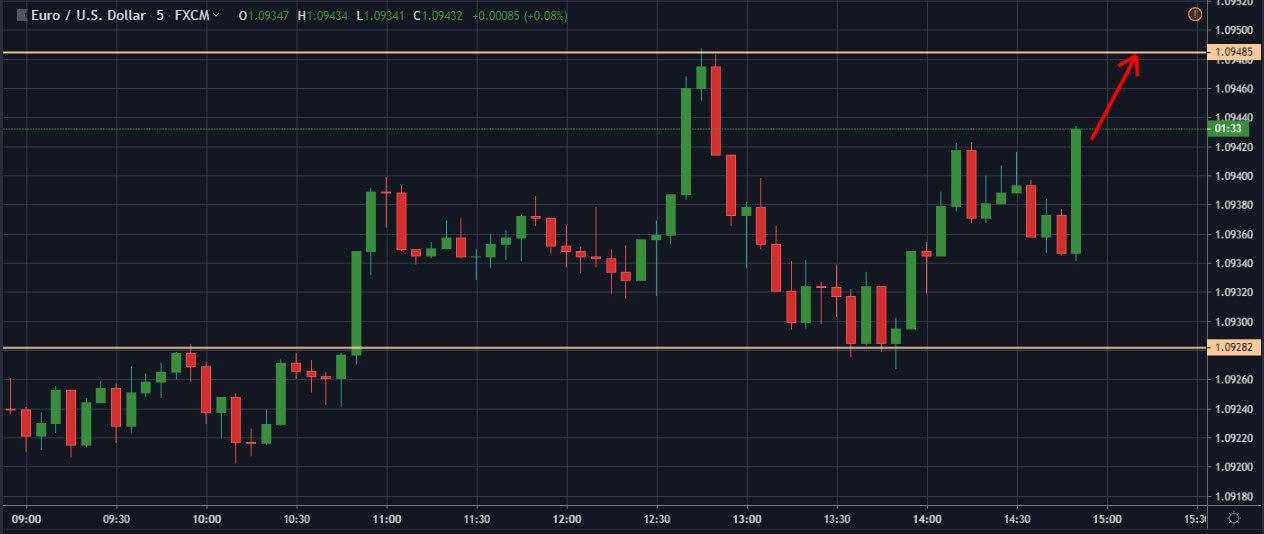 Выше показана сделка по покупке EUR/USD в менее чем десятиминутном окне цены и времени.