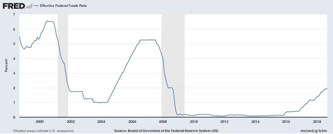 В других странах центральные банки проводят те же операции с той же целью. На графике представлены колебания ставки по федеральным фондам за последние 20 лет.
