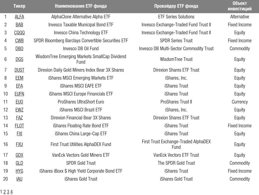 Последняя колонка — размер фонда. Буква “B” значит billion, т.е. миллиард долларов!! В предпоследней колонке отражается размер ежегодной комиссии за управление ETF-ом. Для сравнения, комиссия за управление российскими ETF-ами может быть в 5-10 раз больше комиссии за управление американскими ETF-ми! Идем дальше.