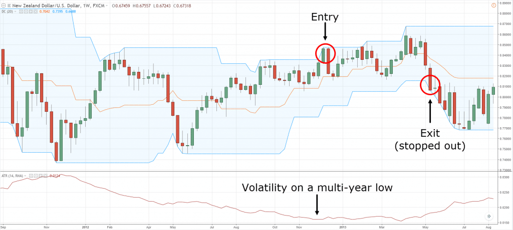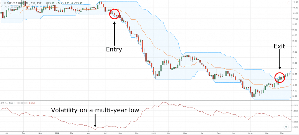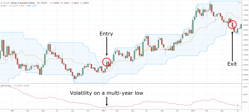 So the ATR indicator helps you identify periods of low volatility and the Donchian Channel lets you trade the breakout to capture the move.