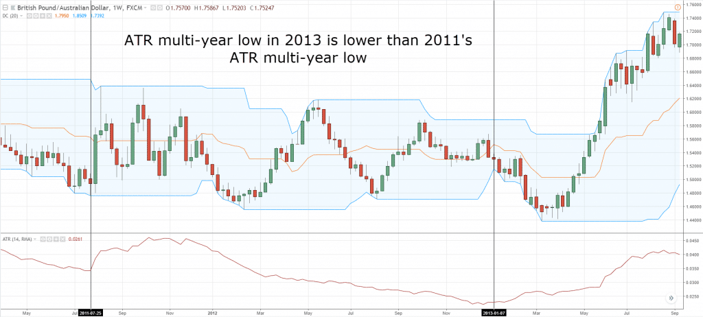 You use the Average True Range indicator (ATR) and identify multi-year low levels on the ATR indicator.