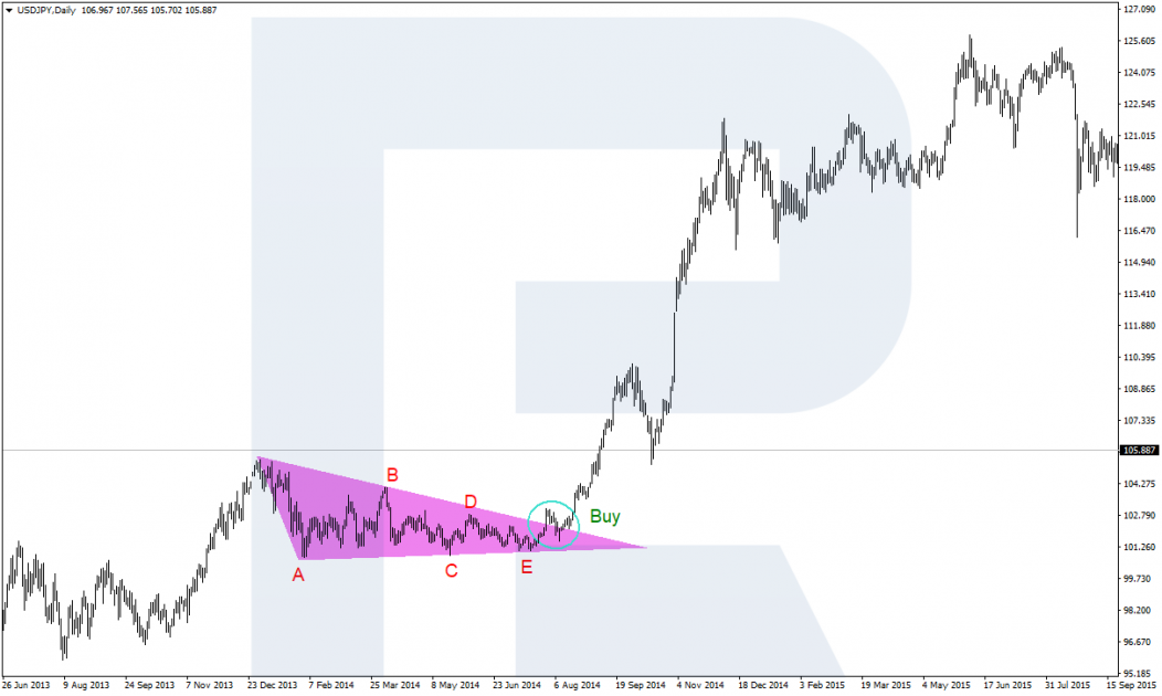 Идентифицировать горизонтальный треугольник можно, соединив двумя линиями максимумы и минимумы паттерна, образующего треугольник. Все волны, из которых он состоит, являются обыкновенными зигзагами (каждый из них имеет трехволновую структуру). Ниже изображен фрагмент графика, на котором сформирован горизонтальный треугольник, а также обозначена точка входа в рынок.