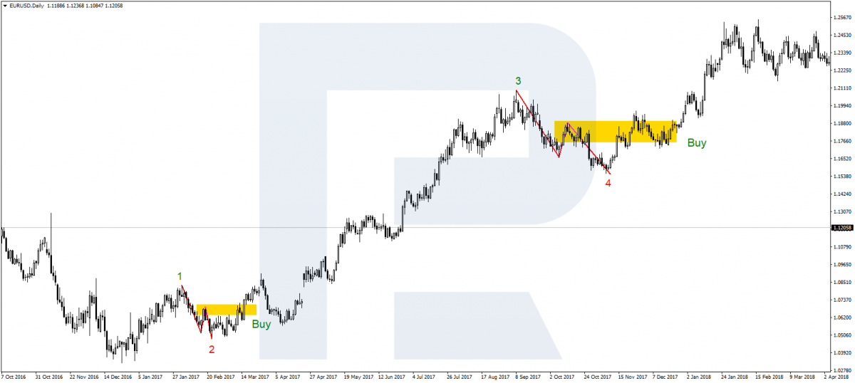 При консервативном подходе к торговле трейдер отрабатывает только движущие импульсы, которые направлены в сторону основного движения. Для нахождения оптимальных точек входа в рынок, необходимо дождаться появления на графике одной из коррекционных формаций.