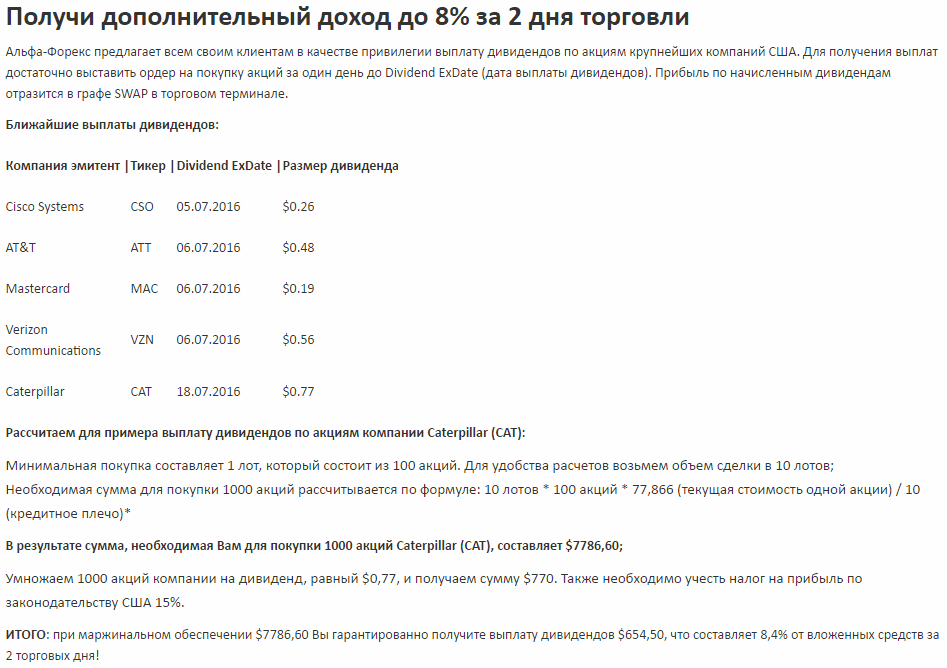 Из описания можно подумать, что котировки акций после выплаты дивидендов не изменяются — ведь прибыль инвестора складывается как из дивидендов, так и из текущего курса акций. А курс акций после выплаты дивидендов, увы, идет вниз — и в среднем как раз на величину дивидендов. Происходит это потому, что после того как компания публикует их величину и время выплаты, дивиденды закладываются в цену акции (в ожидания инвесторов). Вот скрин из терминала Альфа-форекс: