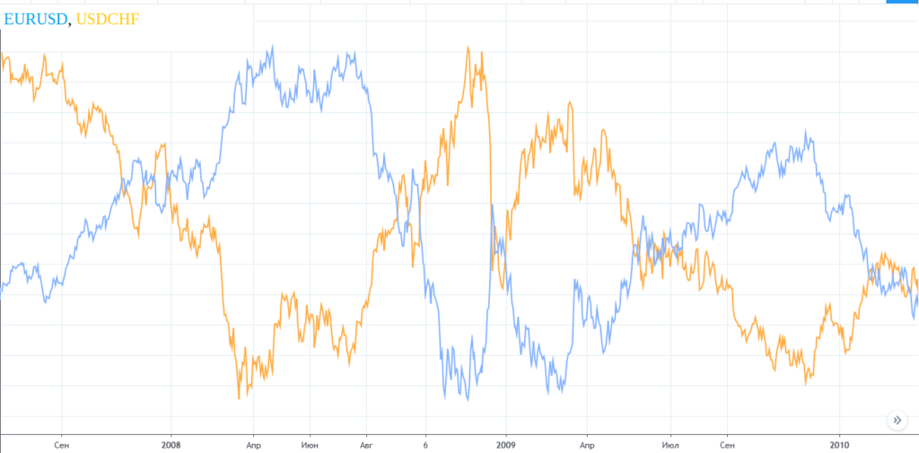 Пример отрицательной корреляции – EURUSD и USDCHF.