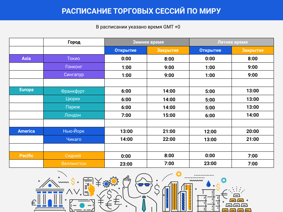 Расписание торговых сессий фондовых бирж мира (время GMT +0):