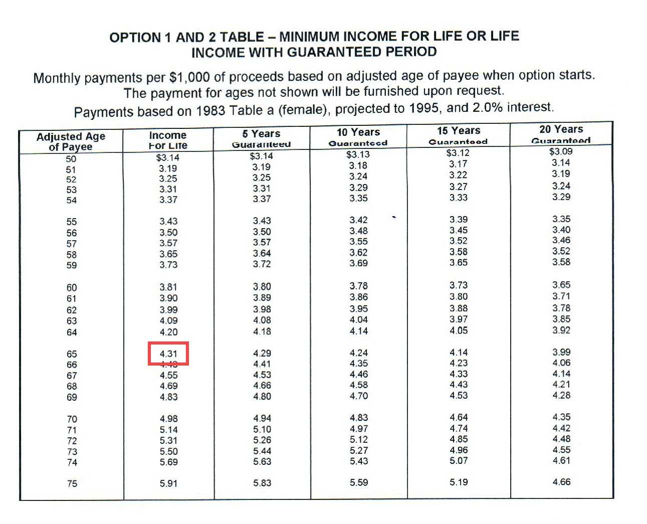 Обведённый красным коэффициент показывает, какую сумму будет получать ежемесячно этот 65-летний человек в качестве пожизненного аннуитета на каждую накопленную в страховке тысячу долларов. Давайте рассмотрим пример.