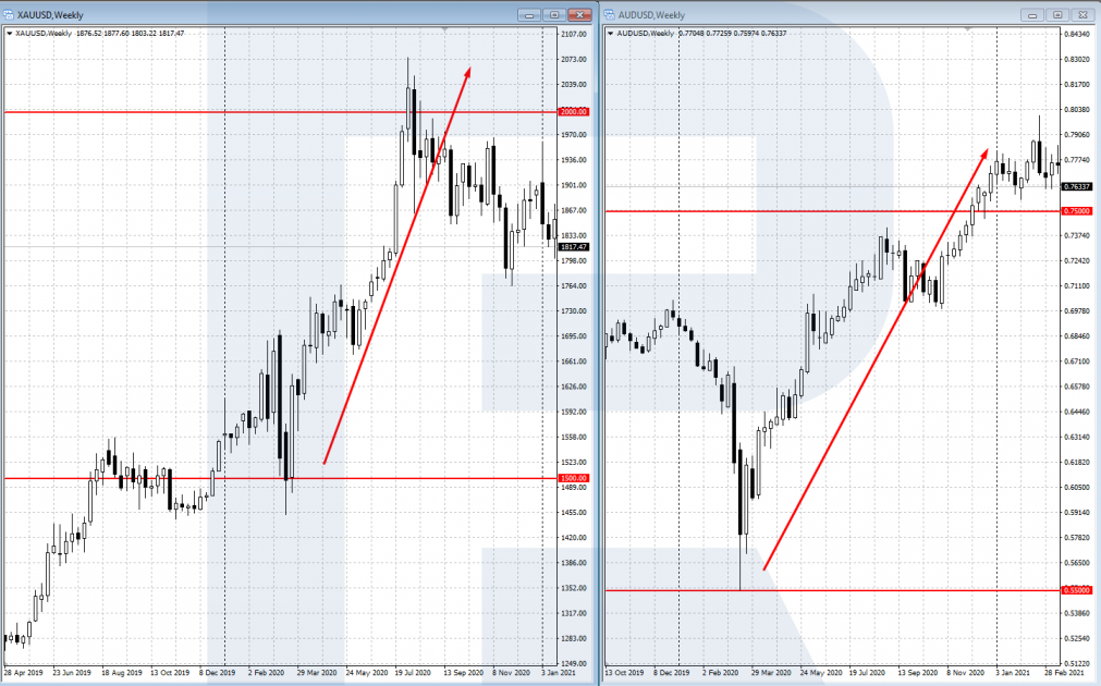 В 2020 году после мартовского падения рынков из-за пандемии коронавируса мировые цены на сырьё начали уверенно расти. В том числе очень сильный рост показало золото, установив очередной исторический максимум выше отметки 2000$ за унцию. Зная, что «оззи» имеет высокую корреляцию с ценой на золото, можно было покупать пару AUD/USD, ожидая её рост.