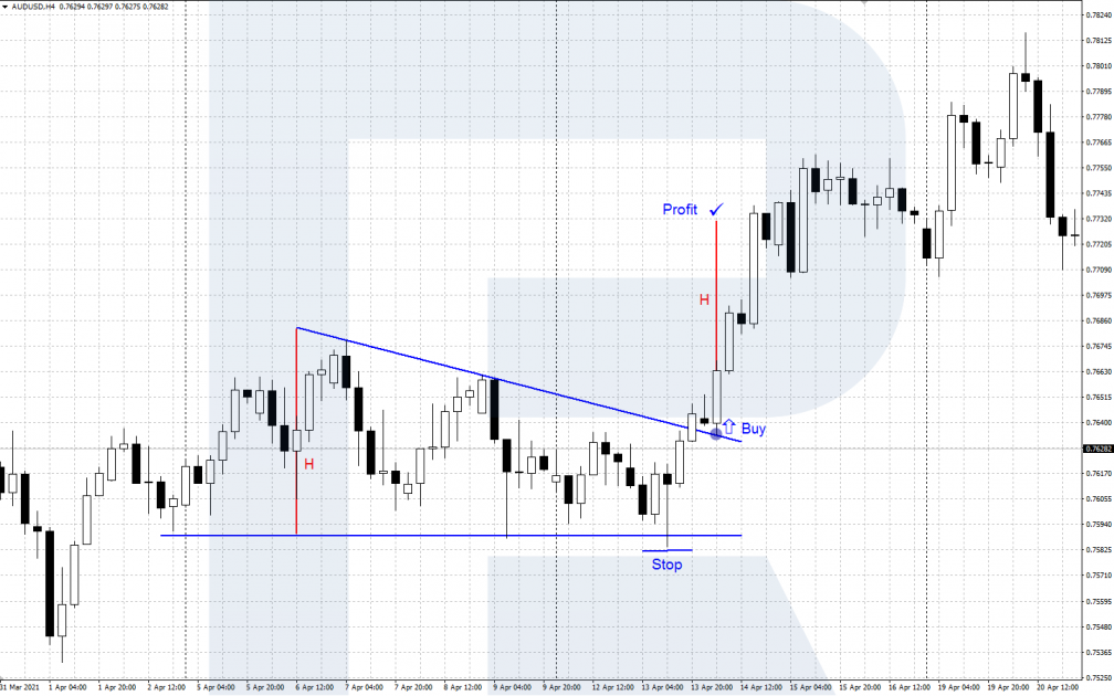 - При пробитии ценой верхней линии фигуры открывается позиция на покупку.