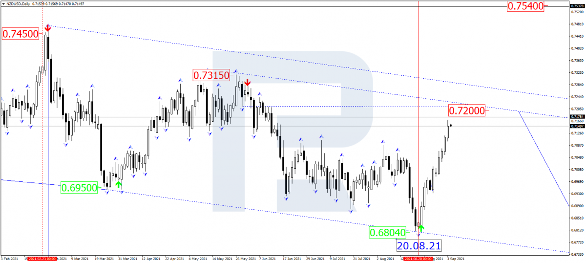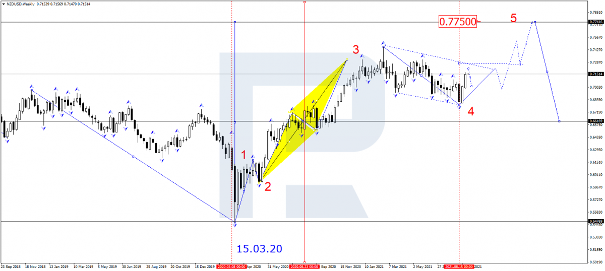 Структура волны Эллиота формируется с 15.03.20, практически одновременно с началом объявления мировой пандемии Covid-19. «Новозеландец» начинает формирование свою волну Эллиотта. Волновая разметка показана на графике выше.