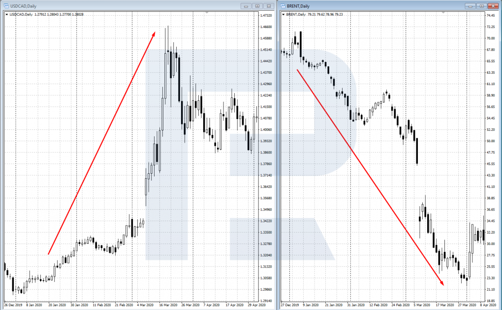 В 2020 году на фоне обвала фондовых рынков, вызванного пандемией коронавируса, мировые цены на нефть стремительно падали. В тот момент на канадский доллар действовали сразу два негативных фактора: укрепление доллара США на фоне бегства инвесторов от рисков и падение цен на нефть. В результате, пара USD/CAD стремительно укреплялась, можно было ее покупать в расчете на рост до окончания острой фазы кризиса и начала восстановления нефтяных котировок.